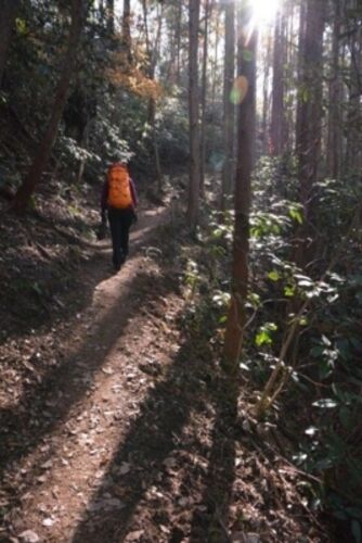 薄暗い杉林が続く 鷲尾山への急登を登り 次第に林の向こうが明るくなる。 ◆稜線に出ること 高知市の南部に東西に尾根を張る 「南嶺」主稜線は照葉樹林に覆われている。 ここまで来れば鷲尾山山頂はすぐそこだ。 ◆鷲尾山山頂のこと 「いい眺めですね!!」 鷲…