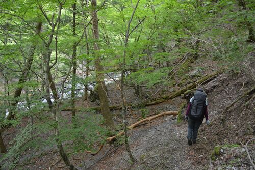 林道の終点手前で渓へ下る山道にはいり奥物部の森に分け入った。 ◆長笹谷へ下る ここまでの林道はウコギ科や蕗、イタドリなど山菜の宝庫で森に入ればキノコが沢山採れていた。 その森は15年前から変わり始めたが別の命が根ざし始めたように感じていて私は余…