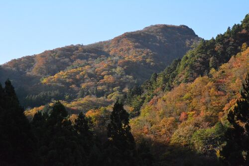 「染まったね~!」 登り口から見える山頂部からここまで一気に下ったようだ。 急に冷えたからねぇ。 ◆頂を見る 登り口の気温9℃は二週間前と変わっておらず訳があっての早駆けのせいかまだ誰も訪れていなかった。 ◆人工林 「クロモジは黄葉」 緑の樹皮の黒斑…