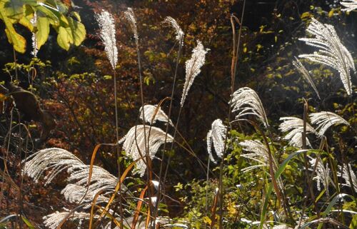 枯れつくした尾花だが枯れた穂が風に吹かれて斜陽に立つさまもまた趣がある。 ◆静かな朝 時折時雨が降る登り口の気温は6度と冬らしい気温となってきた。 ◆分け入る 「今日は陰影が強いかな」 歩き始める人工林の林道は灌木が落葉し陽が射しはじめた。 林道…