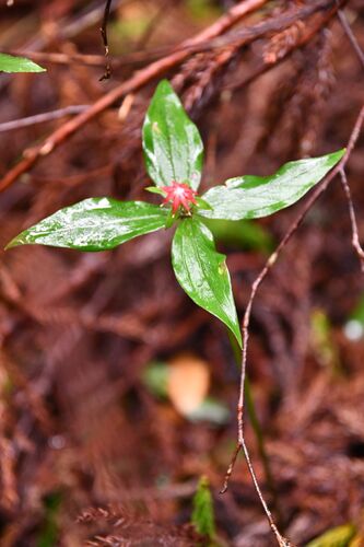 「ツクバネソウの実が落ちた」 黒い実を落としたあとの紅葉したガクが残ったのだろう。 森の時計も綺麗に終わったな。 ◆稜に乗る 植林に射し込む陽を追って山道は急斜面を葛籠折れに上がる。 ここはいい運動になるわぁ。 近道は三辻山登山道に交わり稜線に根…