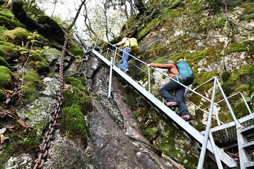 古の修験場真名井の滝の左岸の岩に架かる鎖場を登る。ここからは上は修験場はなく先人も入る事は希だったろう。 ◆真名井の滝頭 真名井の滝頭にはこの山で好きなもう一つの滝釜があり今年も箱庭の様な控えめな紅葉纏う風景を見せてくれた。 山道は真名井の滝…