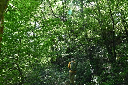 祠のあった大岩が今年も緑に埋まっていた。 これもかつては道標になったんだろうな。 ◆杣道の果て 苔むした石が積まれた東西に延びる稜線近くを杣道は峠に下りはじめ空気が変わる。 その奥に森のまほらがある。 ◆森の中のもう一つの森 姿の見えない鳥たちの…