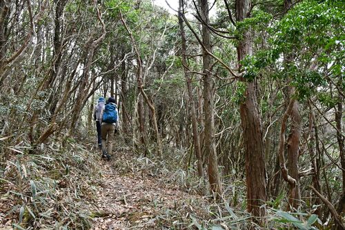 登山道は古の杣道に入る。 工石山南山麓集落から始まるこの山中の道は主稜線に添って土佐北街道まで幾つかの峠を繫ぐ。 ◆稜の道 山道が上がった稜線は日当たりは良いが風雪が強く土壌が乏しいため根生菌と共生出来るリョウブらが守る。 ◆忘れられた園地 稜線…