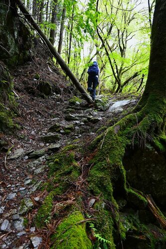 この山の特徴でもある落差20mの滝を成す大岩の右岸を巻いて滝頭に上がる。 ◆滝頭のこと 梶ヶ森にはこのような大岩が稜線近くまであるのが独立して聳えた理由なんだろう。 初夏の渓には若葉だよね。 龍王の滝の頭には大岩が堰き止め出来た釜が四季折々の風景…